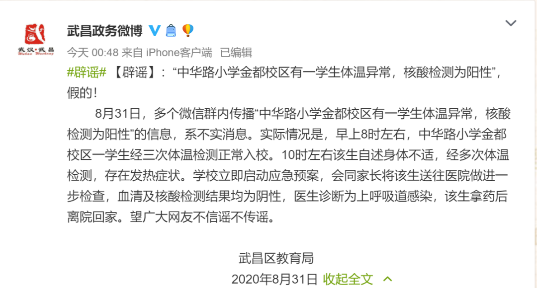 8月31日,多个微信群内传播“(湖北省武汉市武昌区)中华路小学金都校区有一学生体温异常,核酸检测为阳性”的信息。