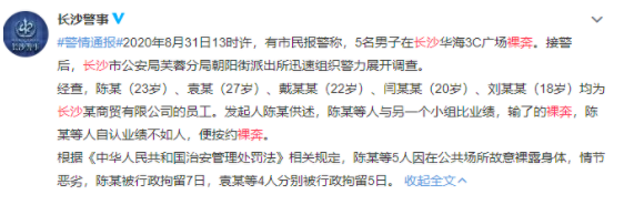 长沙警方随后通报:5名男子系自行约定裸奔,已被行拘处罚。