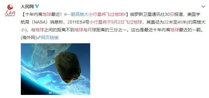 这颗2011ES4 号小行星,将在北京时间9月2号凌晨1点左右,飞行到距离地球最近,这时和我们距离不到地球与月球距离的三分之一。